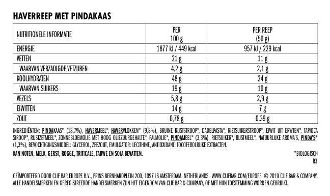 Product gewicht: 50 g Biologisch: Ja Smaak: Havermout, notenpasta met pindakaas Verkoop per: Doos van 12 stuks BTW: Laag Vetten: 11 g Waarvan verzadigde vetzuren: 2,3 g Koolhydraten: 24 g Waarvan suikers: 9,5 g Vezels: 2,9 g Eiwitten: 7 g Zout: 0,39 g Energie: 957 kJ / 229 kcal Product Type: Energiereep Verpakkingsinhoud: 1 reep Gebruik: Voor, tijdens en na de activiteit Allergie informatie: Kan noten, melk, sesam, gerst, rogge, triticale en tarwe bevatten.