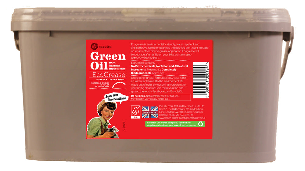 Inhoud - volume: 5 L Ecologisch: Ja Biologisch afbreekbaar: Ja Gebruiksaanwijzing: Gebruik Ecogrease op headsets, koppelstukken, quick-release pins, bouten, zadelpennen en meer. Gebruik: Werkplaats Verpakkingseenheid: Per stuk Toepasbaar op: Draaipunten, headset, quick-release pins, seatposts Content artikel: Bidon