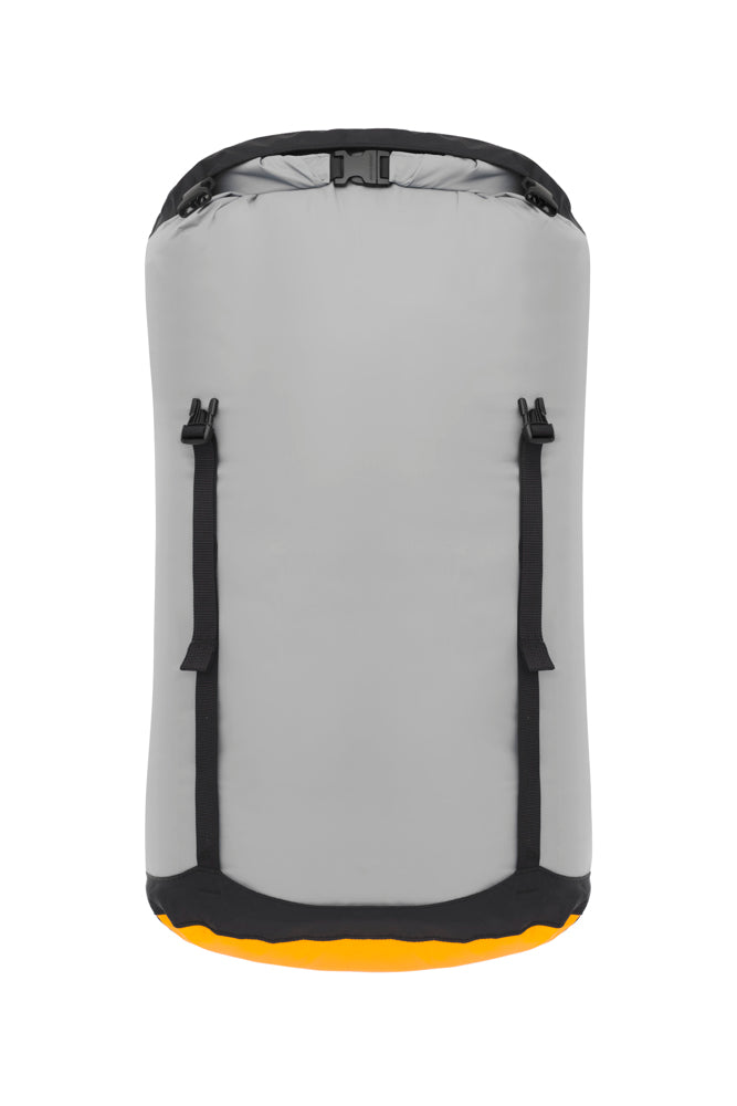 Betrouwbare droge compressie opslag voor al je activiteiten van bikepacking tot motorrijden, zeekajakken en meer. Het hoofdmateriaal is gemaakt van bluesign goedgekeurd gerecycled waterdicht 70D nylon en de bodem is gemaakt van waterdichte en tevens luchtdoorlatende 70D eVent® die het mogelijk maakt lucht naar buiten te persen terwijl de inhoud droog blijft. Dit betekent dat er geen ontluchtingsventiel nodig is, waardoor de Evac Compression Dry Bags licht en eenvoudig zijn. Vier compressiebanden maken het gemakkelijk om zachte voorwerpen gelijkmatig te comprimeren, terwijl de waterdichte hypalon rolsluiting het water buiten houdt. De DWR afwerking op beide stoffen is C0 en PFC-vrij. Eenvoudig, robuust en betrouwbaar - het toppunt van duurzaamheid, veelzijdigheid en droge compressie. Het robuuste, waterdichte 70D gerecyclede Nylon hoofdmateriaal met PU-coating heeft een hydrostatische weerstand van 10.000 mm. Dubbel gestikte en met tape afgewerkte naden voor betrouwbare waterdichtheid. Stevig nylon handvat op de ovale bodem voor veel grip. Licht reflecterende witte binnencoating maakt het zien en vinden van spullen gemakkelijker.